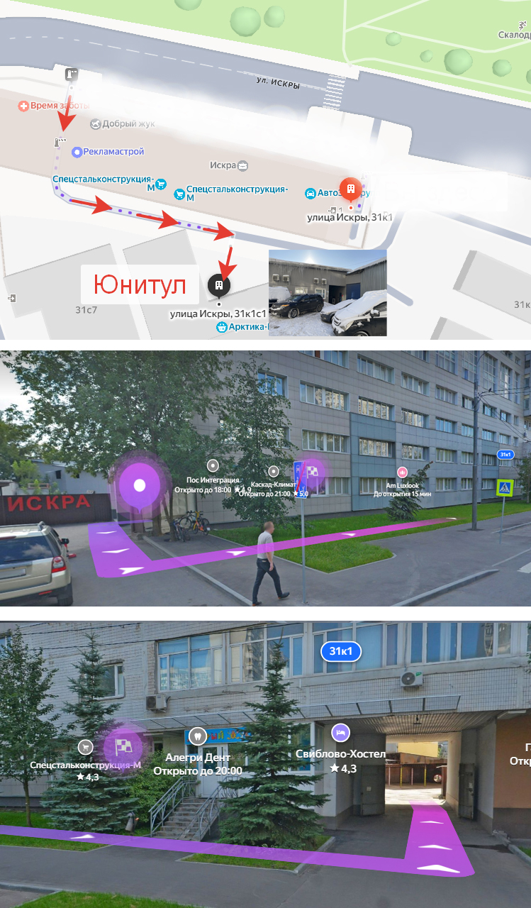 - проходите около 500 метров, с левой стороны серое 7-этажное здание, вход в арку в середине здания (слева от столовой), затем пройти 50 метров и повернуть направо (вывеска Офис)