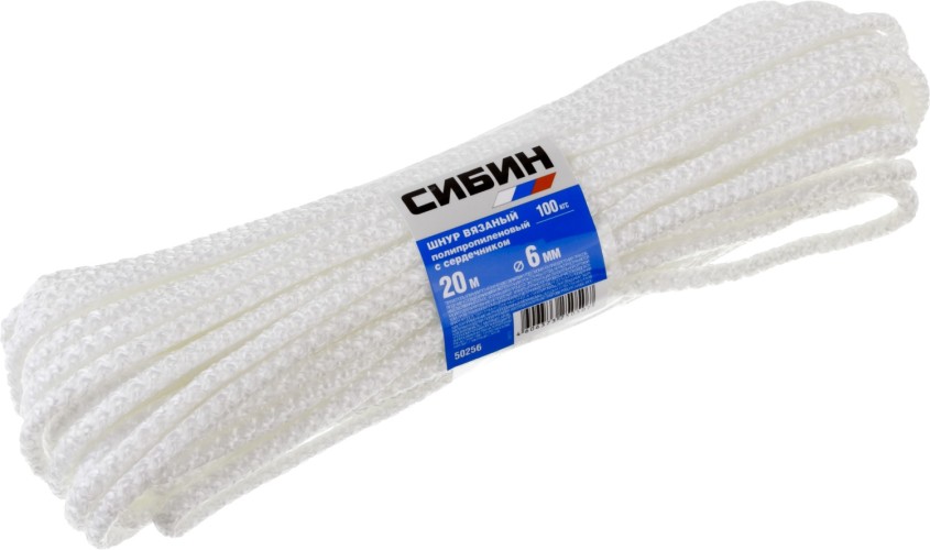 Шнур вязаный полипропиленовый СИБИН с сердечником, белый, длина 20 метров, диаметр 6 мм, ( 50256 )