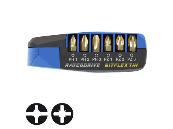 Набор бит Witte Ratchdrive Bitflex PH/PZ + трещёточный битодержатель 25105 - компактный, мощный, профессиональный. Промышленные биты с узкой шейкой: PH1 Bitflex х 25 мм, PH2 Bitflex х 25 мм, PH3 Bitflex х 25 мм, PZ1 Bitflex х 25 мм, PZ2 Bitflex х 25 мм, PZ3 Bitflex х 25 мм и трещёточный битодержатель.