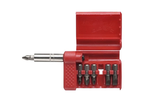 Содержит биты PH 1, PH 2, PZ 1, PZ 2, шлиц 0,8 x 5,5 мм, 1,2 x 6,5 мм и держатель 26006.