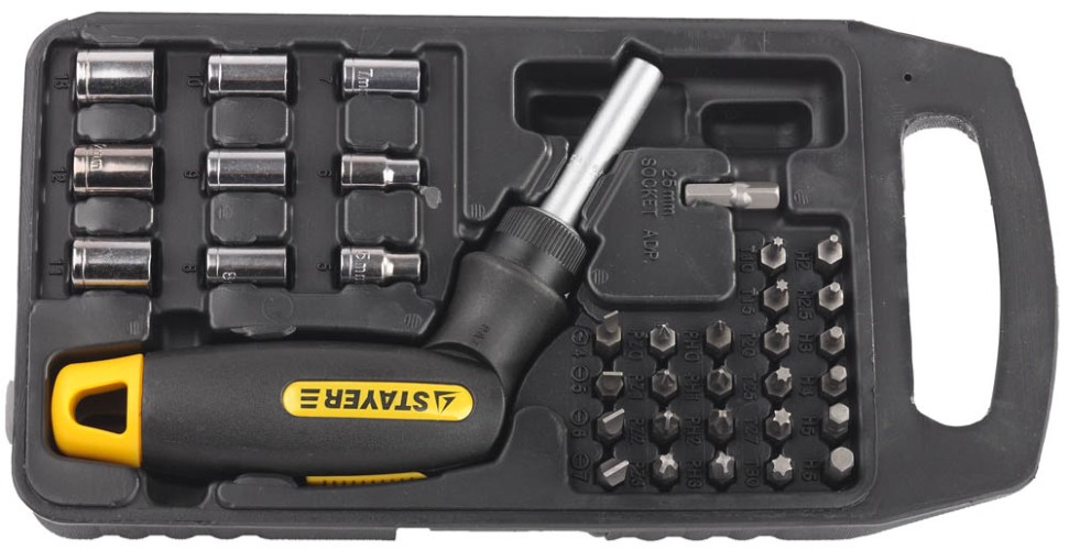 Набор STAYER "PROFI": Отвертка реверсивно-рычажная с торцовыми головками и битами, 34 предмета, ( 25564-H34 )