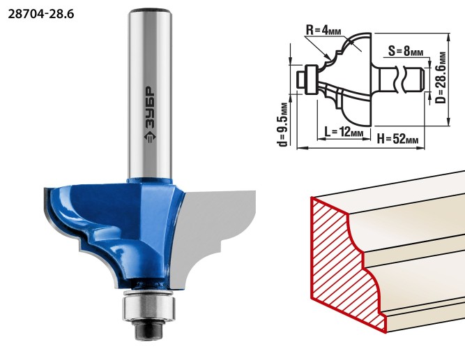 Фреза кромочная калевочная №3, D= 28,6мм, рабочая длина-12мм, радиус-4мм, хв.-8мм, d-9,5мм, ЗУБР Профессионал, ( 28704-28.6 )