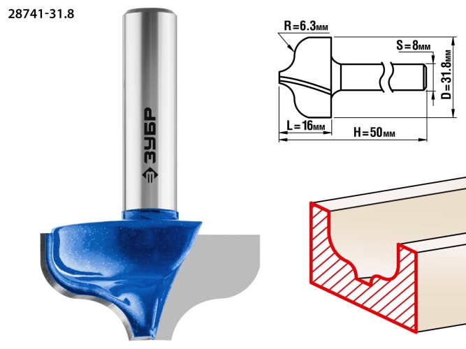 Фреза пазовая фасонная №2, D= 31,8мм, рабочая длина-16мм, радиус-6,35мм, хв.-8 мм, ЗУБР Профессионал, ( 28741-31.8 )