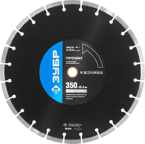 Круг отрезной алмазный ЗУБР "ПРОФИ" по бетону, для спец инструмента, сухая и мокрая резка, 25,4х350мм, ( 36665-350 )