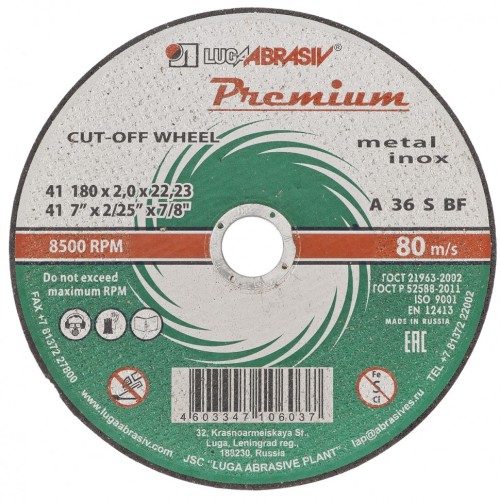 Круг отрезной по металлу и нержавеющей стали, 180 х 2,0 х 22 мм, Премиум "Луга" Россия ( 73734 )
