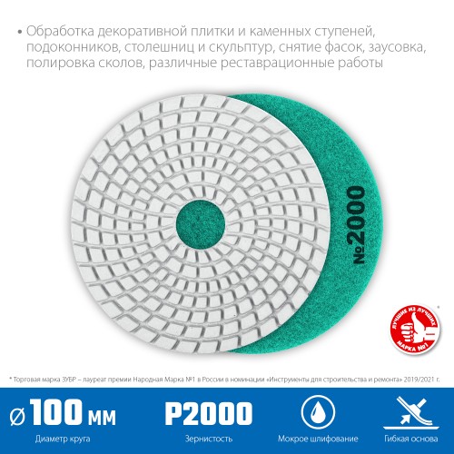 Для шлифовки и полировки изделий из натурального и искуственного камня, керамогранита, гранита, мрамора с применением водяного охлаждения. Используется на ручном электроинструменте (УШМ, полировальные машины, дрели) с насадкой адаптером под липучку Velcro.