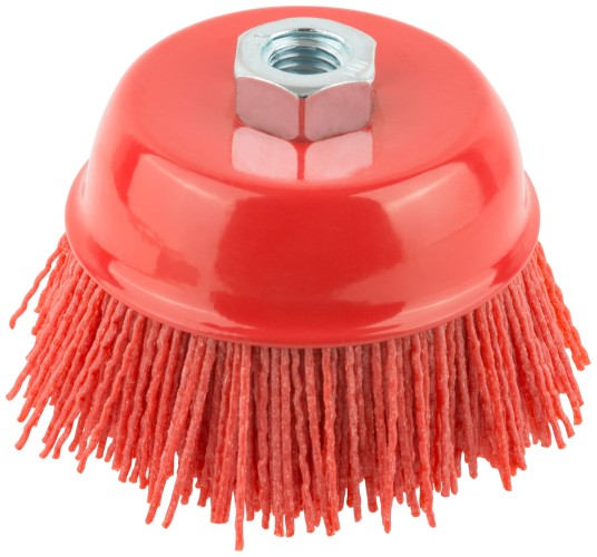 Тип «чашка». Нейлоновая. Для УШМ. Гайка М14. Для браширования древесины, удаления заусенцев, загрязнений и полировальных работ по дереву, пластику, стали и цветным металлам. Материал: нейлон, алюминий-оксидный абразив, основа из инструментальной стали. Упаковка: картонная коробка.