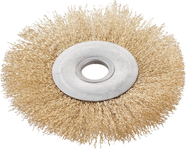 Дисковая щетка ЗУБР ЭКСПЕРТ для точильно-шлифовального станка, посадочное отверстие от 13 до 32 мм, 5 втулок ( адаптеров) в наборе ( 35186-*** ) Используется на точильно-шлифовальных станках для зачистки от лакокрасочных покрытий, ржавчины, окалины и различных загрязнений с поверхностей изделий из стали и цветных металлов. Материал изделия витая стальная латунированная проволока толщиной 0,3 мм. Латунированное покрытие защищает рабочую часть щетки от коррозии. Щадящая обработка поверхности без повреждений благодаря витой проволоке. Универсальное посадочное отверстие 32 мм+5 втулок под разные диаметры. Для установки на электроточило с другим диаметром вала воспользуйтесь пластиковым переходником соответствующего диаметра. В комплекте 5 пластиковыx адаптеров (втулок) на 1/2", 5/8", 3/4", 7/8", 1" вал. Максимальное количество оборотов 6000 об/мин. для арт. 35186-125 Максимальное количество оборотов 5500 об/мин. для арт. 35186-150 Максимальное количество оборотов 4500 об/мин. для арт. 35186-200