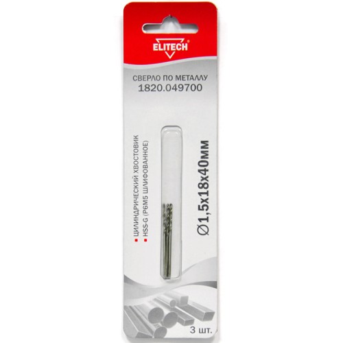 Сверло д\металла, 1.5х18х40мм, HSS-G (Р6М5 шлифованное),3шт,хв-цилиндр, блистер, ELITECH, ( 1820.049700 )