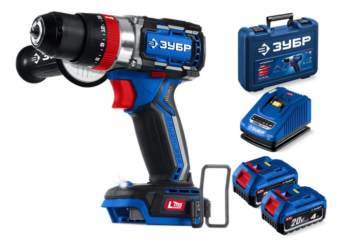 ЗУБР 20 В, 70 Н·м, 2 АКБ LMS (4 А·ч), бесщеточная ударная дрель-шуруповерт, кейс, ПРОФЕССИОНАЛ (DBS-70-42)